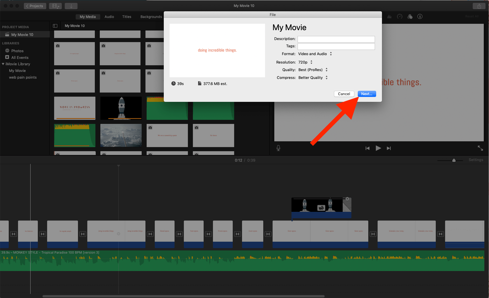 - Export from iMovie to File (recommend using the highest settings possible, but ultimately doesn't affect the process.)
