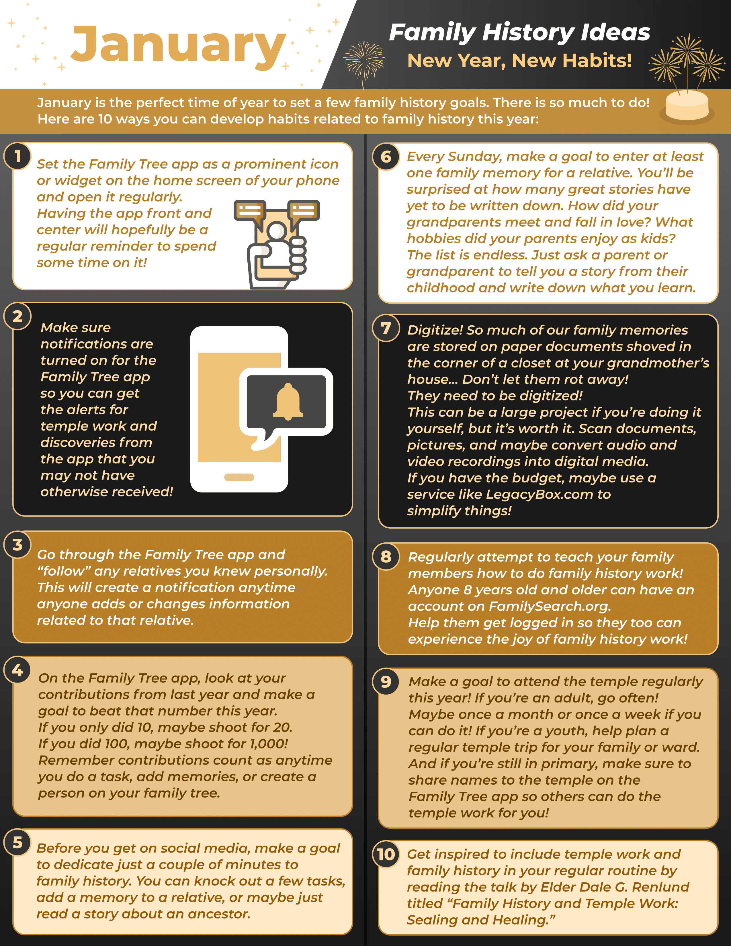 - On the Family Tree app, look at your contributions from last year and make a goal to beat that number this year. If you only did 10, maybe shoot for 20. If you did 100, maybe shoot for 1,000! Remember contributions count as anytime you do a task, add memories, or create a person on your family tree.