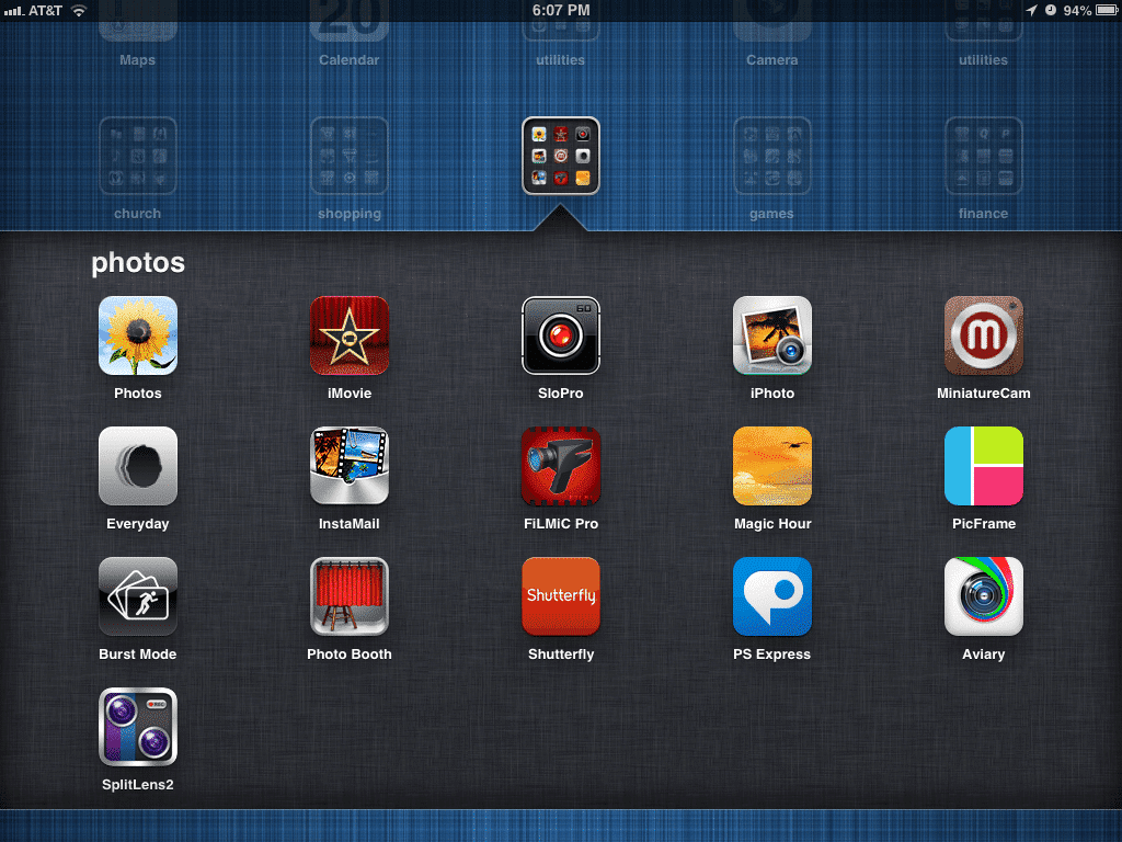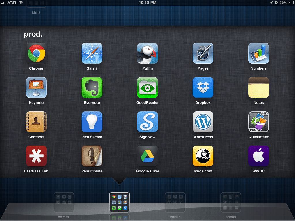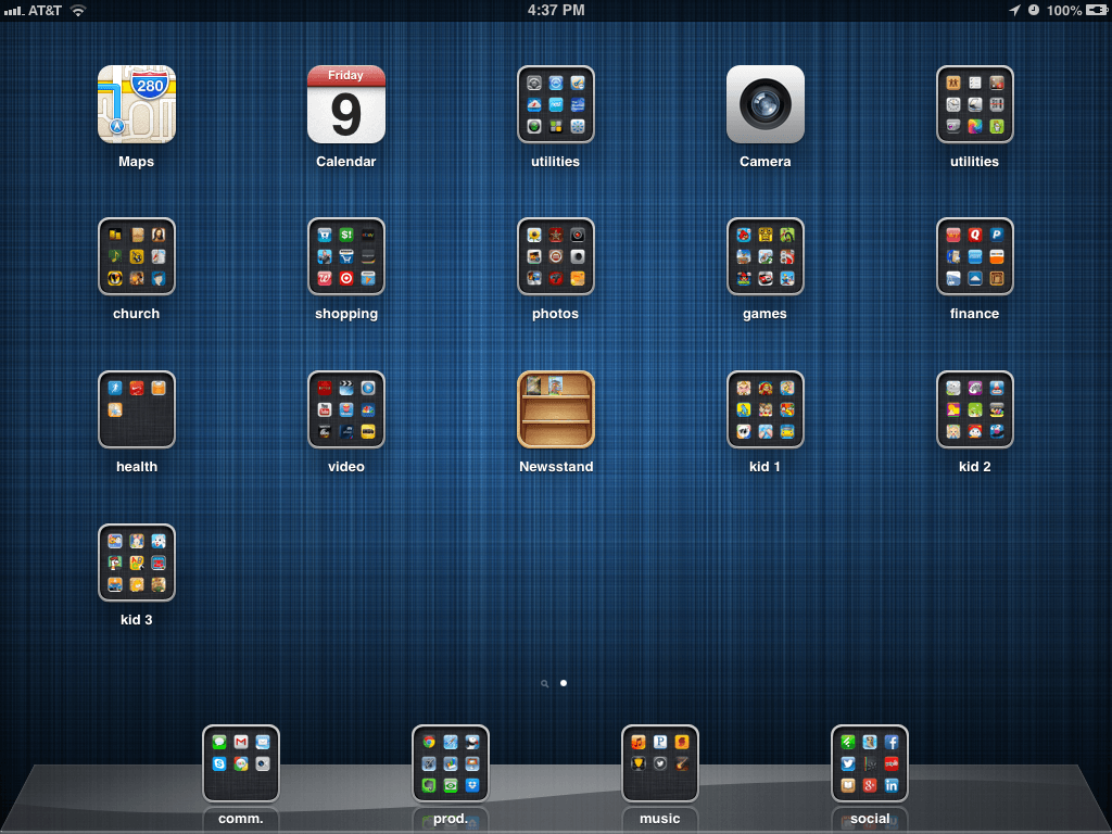 Basic home screen layout here. I'm a heavy folder user so all of my apps are tucked away nicely into their individual homes. One trick most I've realized a lot of people don't know about is the ability to put folders in the main bottom bar in iOS. This is done by creating the folder in the main area, then dragging the already created folder down to the main bottom bar. Here are the apps I have direct access to from the home view: