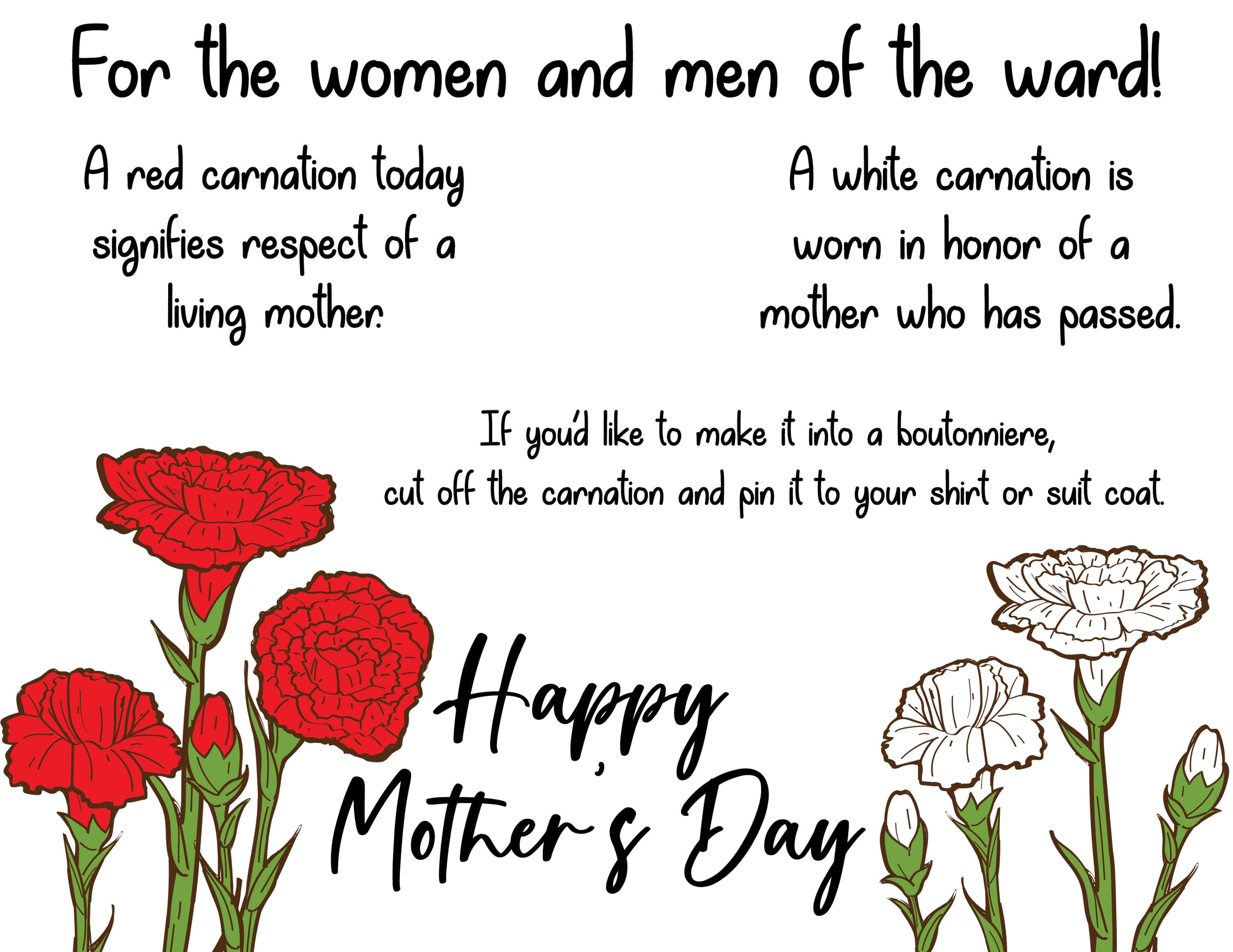 The idea is this: Everyone gets a carnation. EVERYONE. Guy or girl. There are two colors of flowers, red and white. You grab a red flower to show respect for your living mother. You grab a white flower to show honor for your mother who has passed.